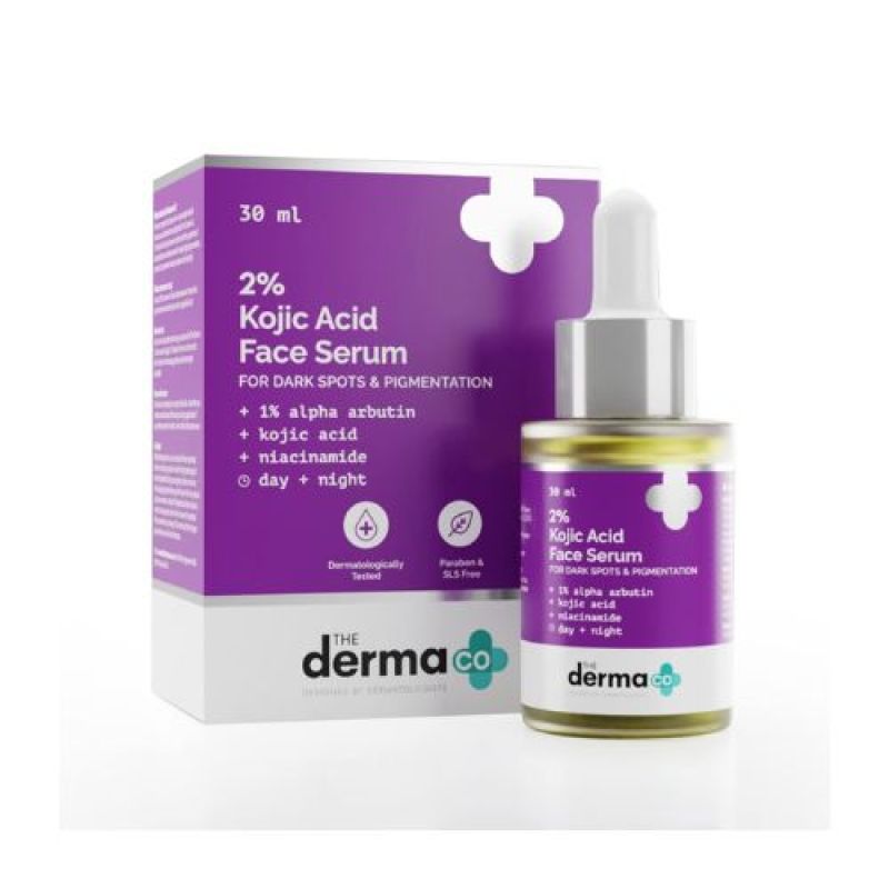 The Derma Co 2% Kojic Acid Face Serum I With 1% Alpha Arbutin & Niacinamide I For Dark Spots & Pigmentation I Anti-Pigmentation Face Serum For All Skin types - 30ml. The Derma Co 2% Kojic Acid Face Serum is a powerful skincare product designed to brighten and even out skin tone. Formulated with 2% kojic acid, it helps reduce dark spots and hyperpigmentation while promoting a radiant complexion. Lightweight and fast-absorbing, this serum is perfect for daily use in any skincare routine.
